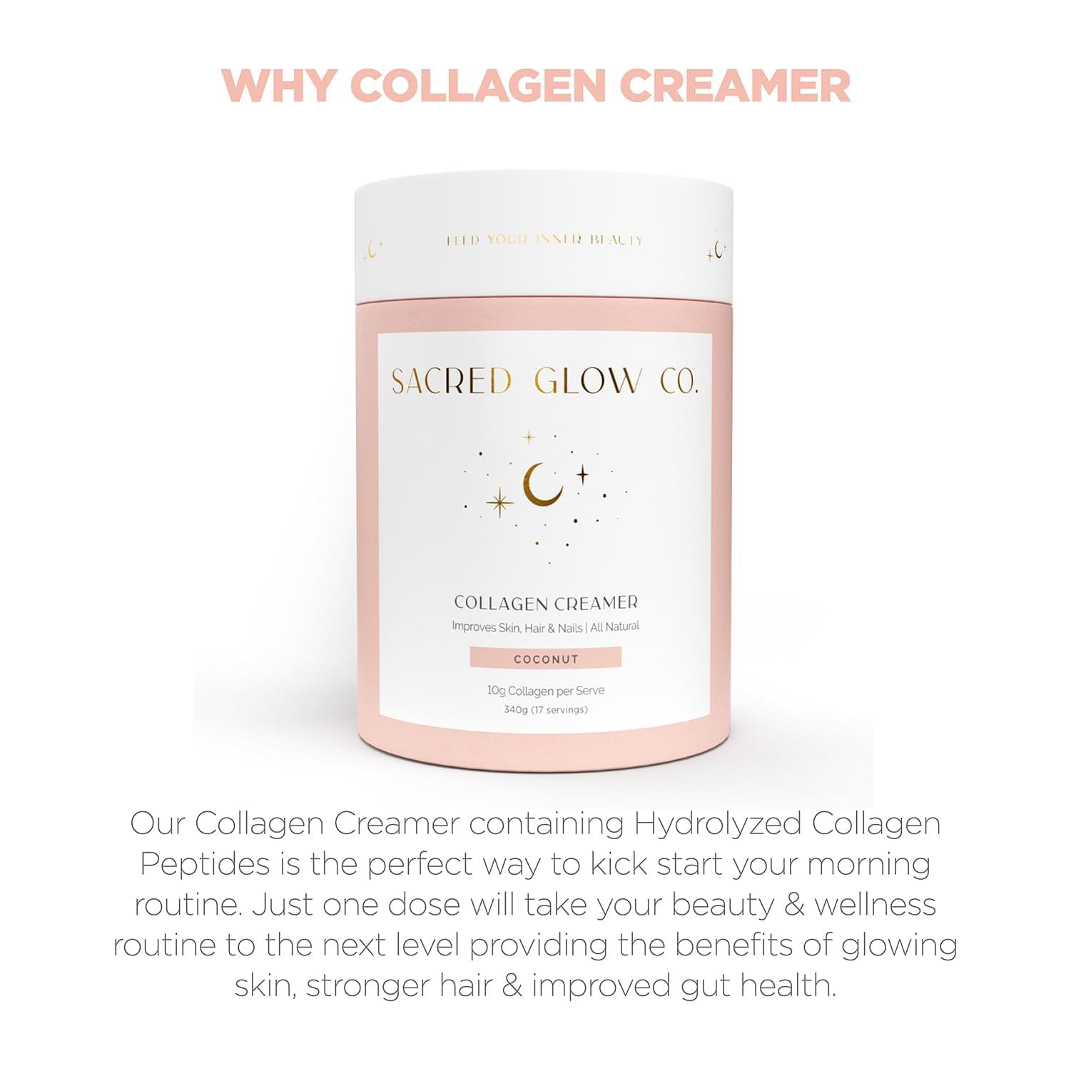 Our Collagen Creamer containing Hydrolyzed Collagen Peptides is the perfect addition to your morning routine. It helps to increase your bodies collagen supply from the inside out, providing the benefits of glowing skin, stronger hair & nails.