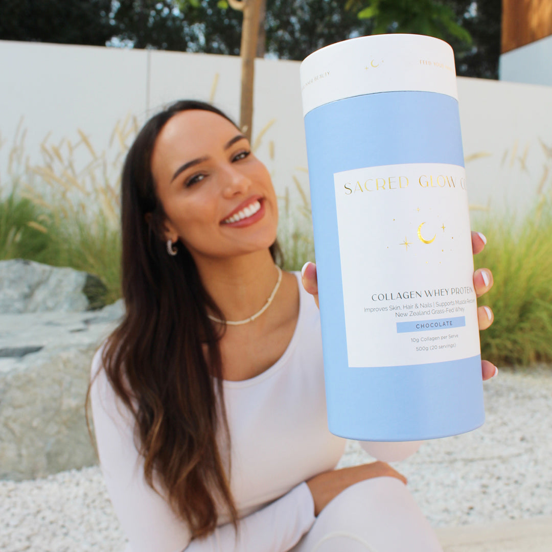 Sacred Glow Co. Collagen Chocolate Whey Protein has been delicately refined so it tastes absolutely perfect when you add it to your daily protein needs whilst also adding creaminess to your smoothies.