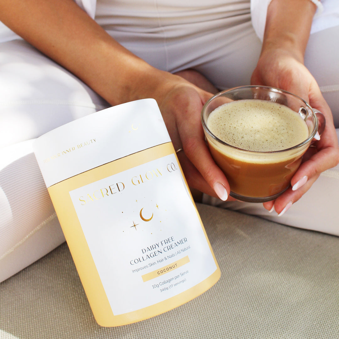 Our Dairy Free Collagen Creamer is the perfect addition to your morning routine. It helps to increase your bodies collagen supply providing the benefits of glowing skin, stronger hair & nails.